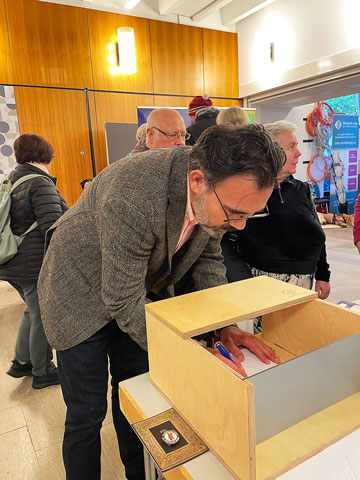 Stadtrat Francesco Arman an der Spiegelkiste Nicht alle Zeichnungen waren als Sonne zu erkennen. Die Besucherinnen und Besucher gaben sich aber viel Mühe und hatten vor allem viel Freude an der Aufgabe.